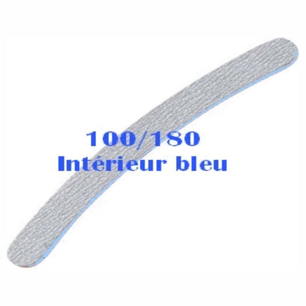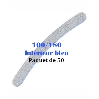 The zebra boomerang 100/180 file has a rough grit on one side and a soft grit on the other side, has a blue cushioned interior, and is ridged along the length.